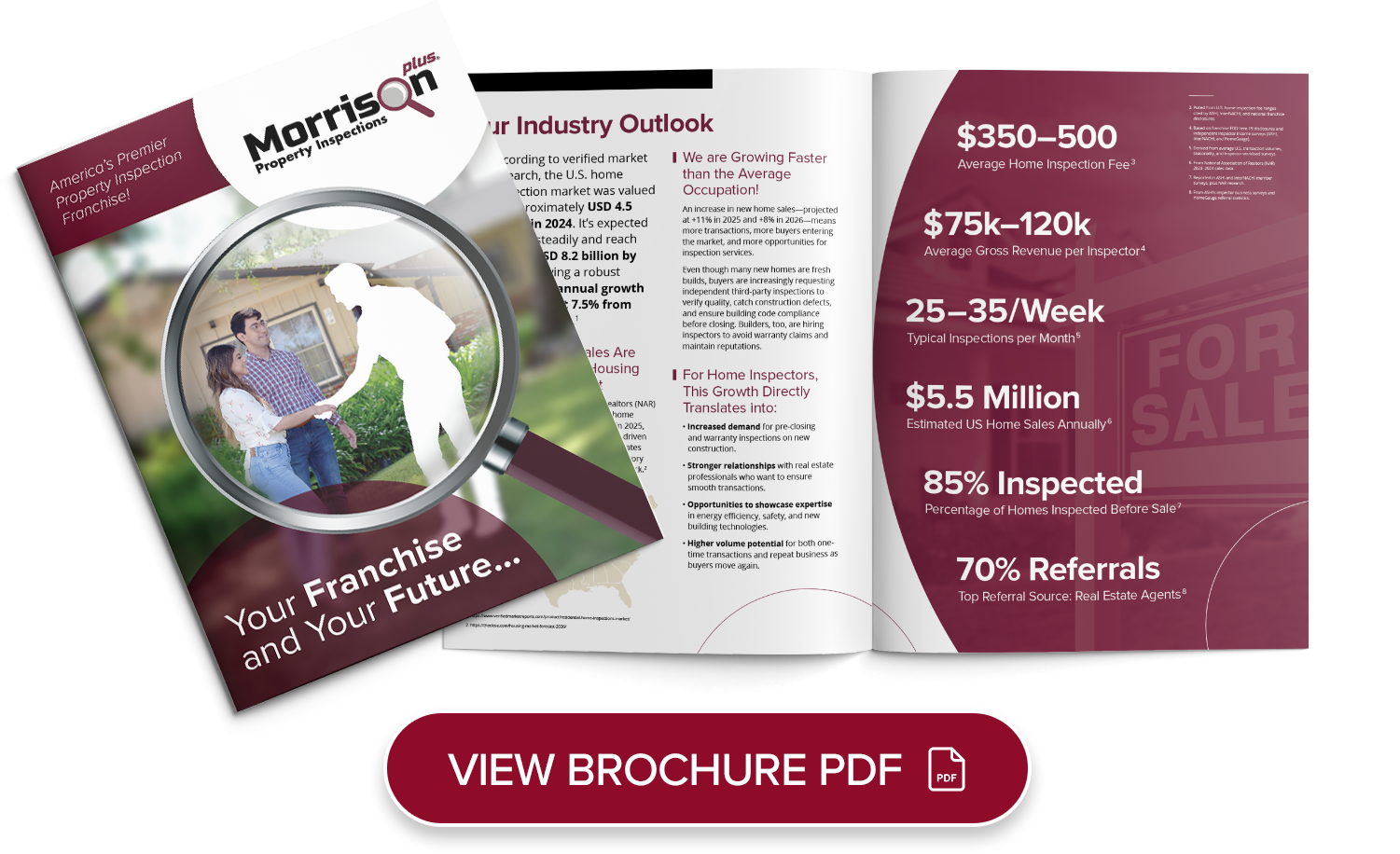 A property inspection franchise with Morrison Plus offers you a great gateway to start and own your own business while pursuing a successful career. With our low cost of entry and proven success model, you’ll be up and running your own franchise in no time!